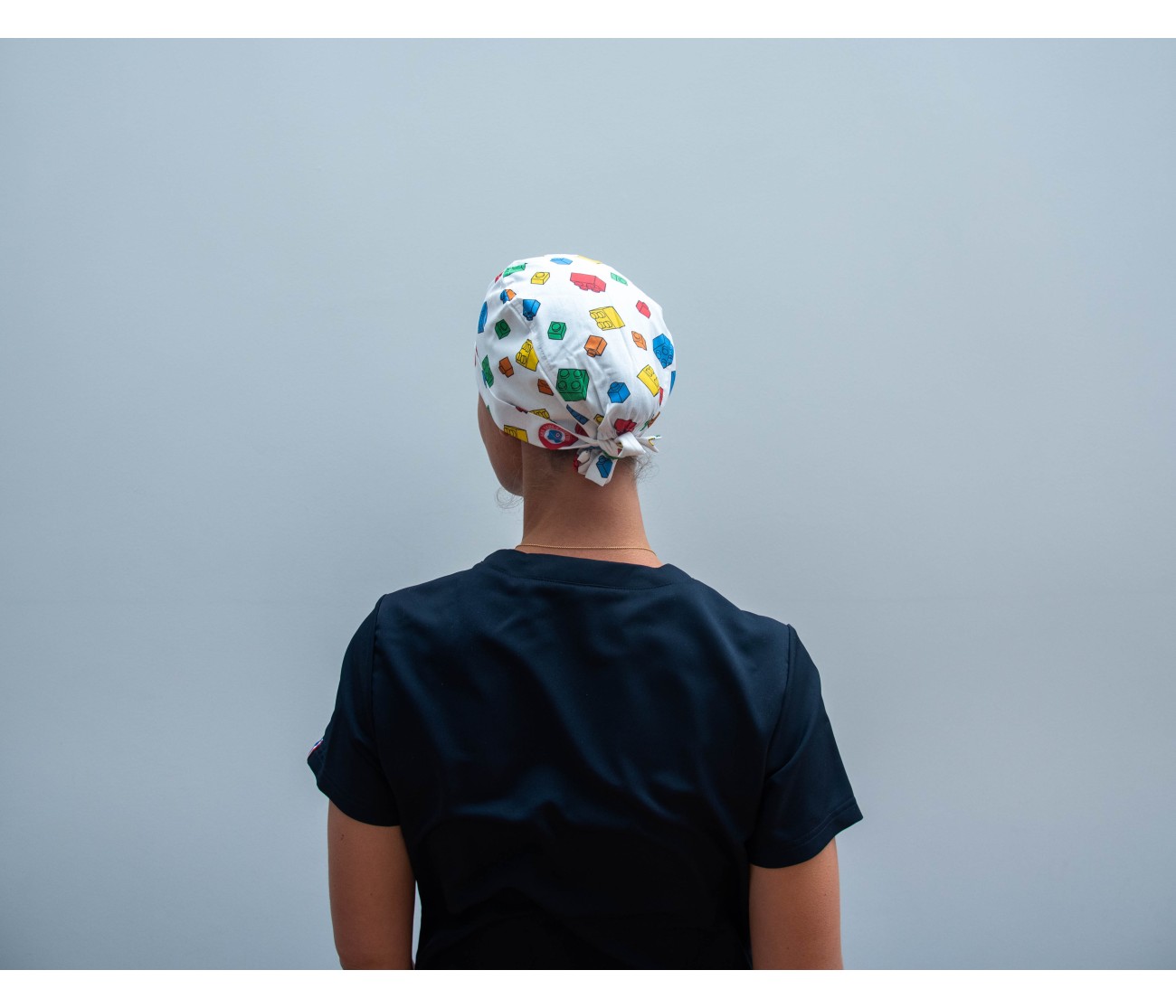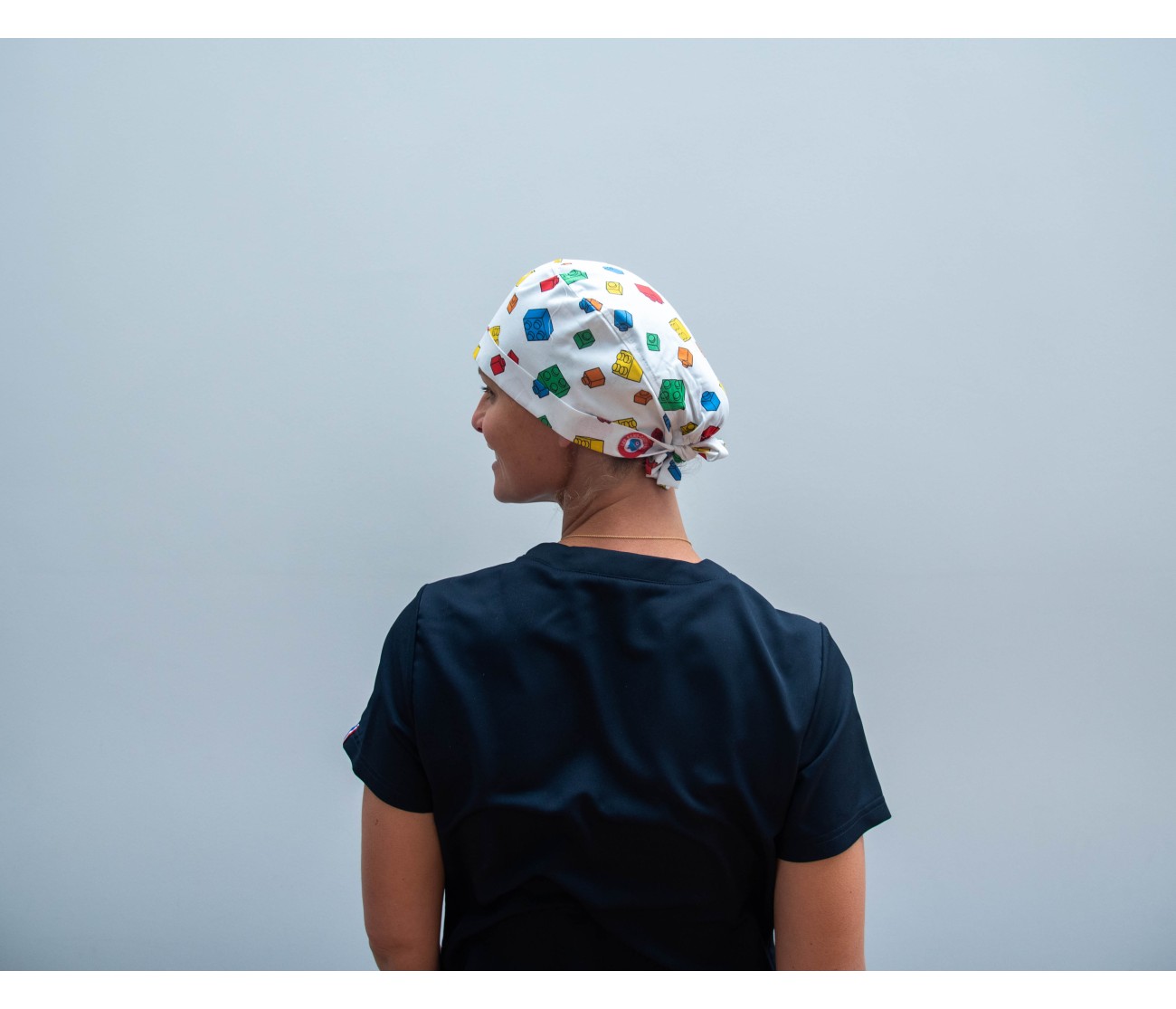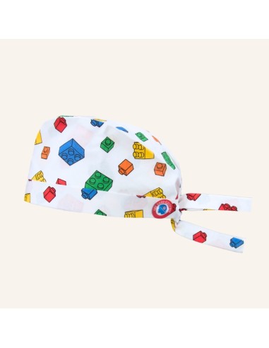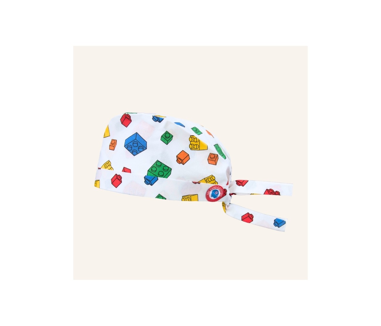 Calot de bloc en coton blanc aux motifs des célèbres briques colorées, sur lesquelles mieux vaut ne pas marcher pieds nus :)