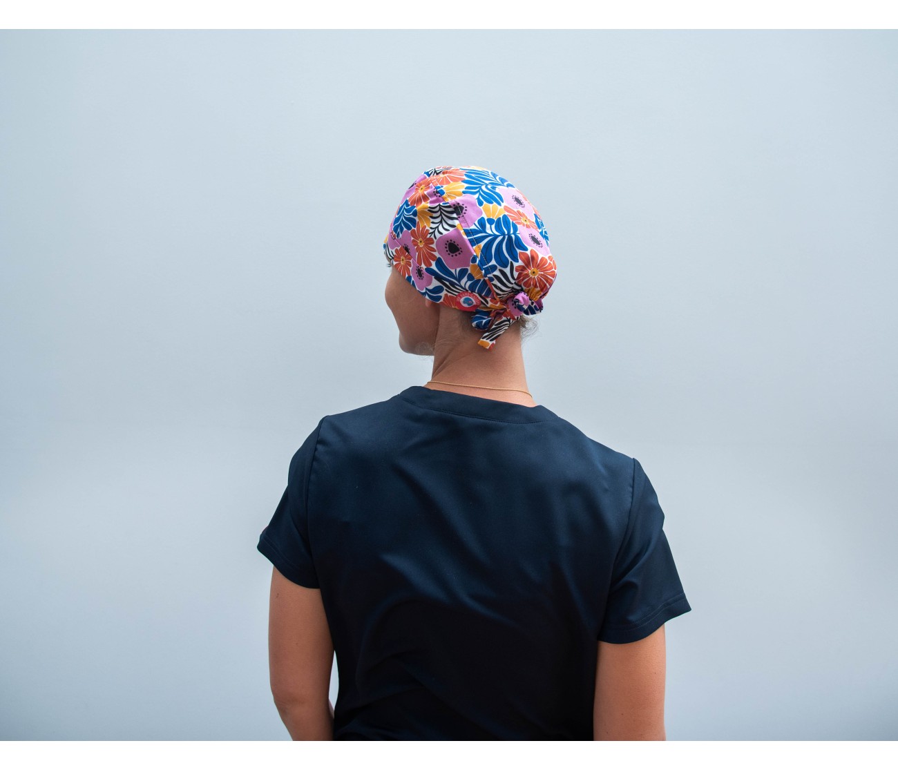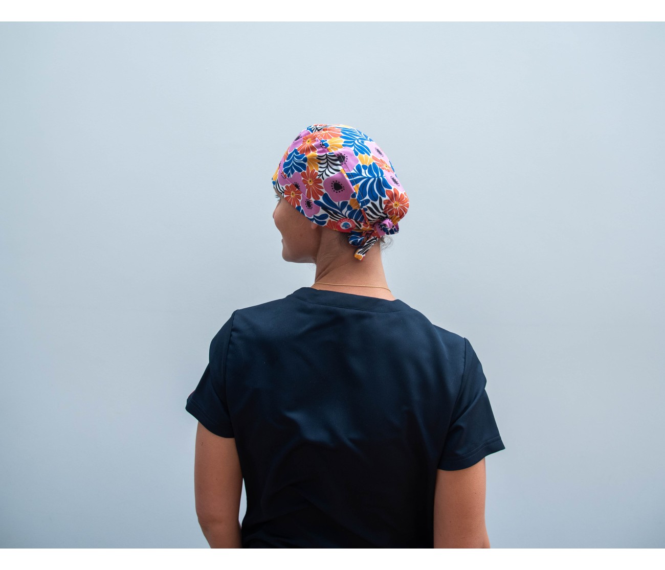 Calot de bloc en coton blanc aux motifs de grandes fleurs roses et oranges et de feuillages bleus, rappelant les célèbres œuvres d'Henri Matisse