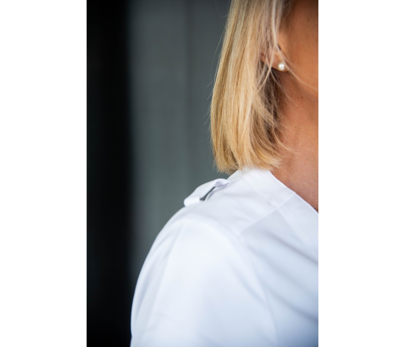 - Tunique blanche : Stéphanie, qui est dentiste, porte une tunique S et met habituellement du 36.